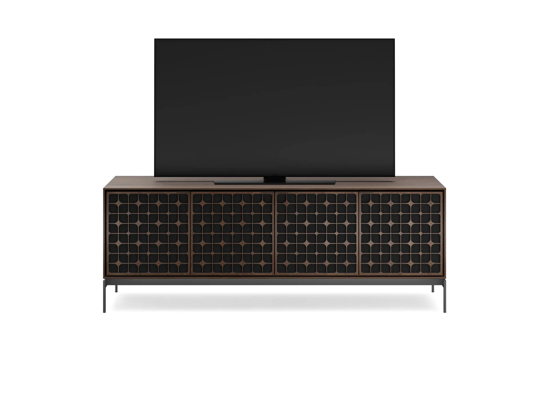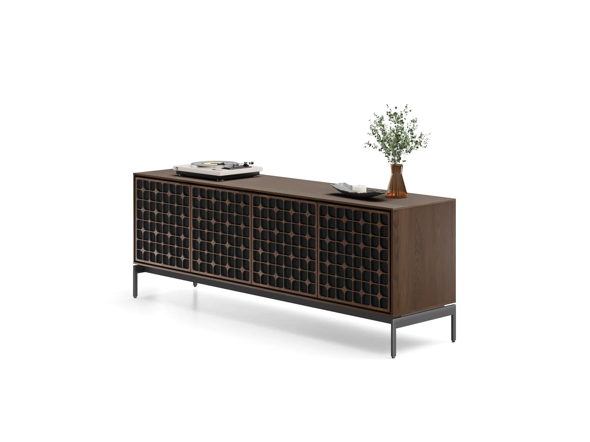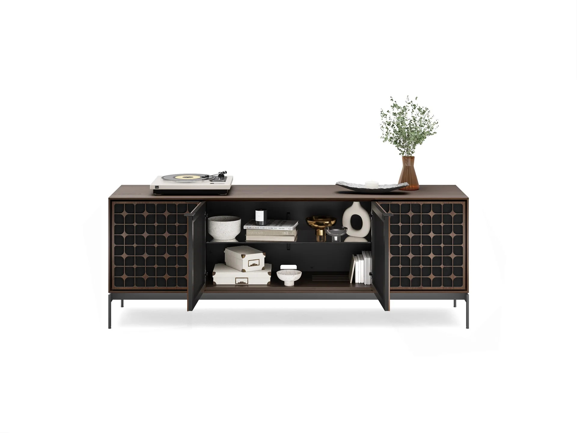 Behind Elements' CONSTELLATION doors, adjustable shelves and spacious interiors offer versatile storage solutions, perfect for both media components and everyday essentials. The celestial pattern not only enhances the cabinet's design but it is also engineered for acoustic transparency, ensuring flawless performance for enclosed speakers and soundbars, all while keeping your belongings beautifully organized.