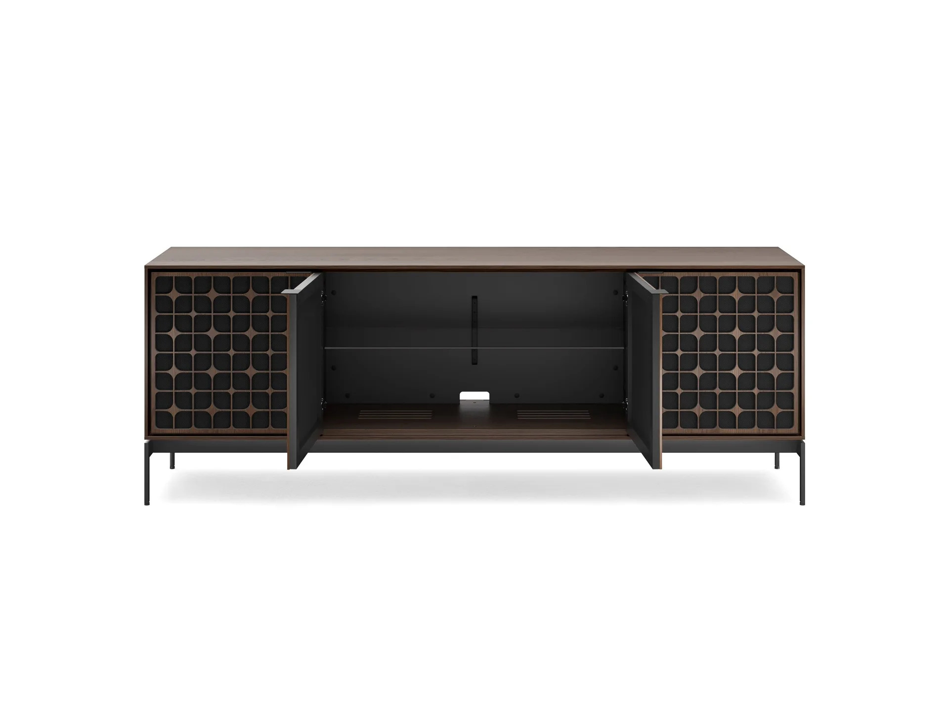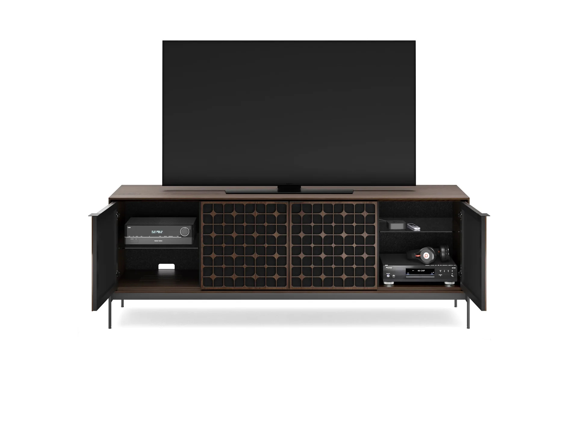 Precisely crafted doors with perforated metal backing offer ventilation and IR-remote compatibility, keeping your media components accessible and ventilated with sleek, understated elegance.