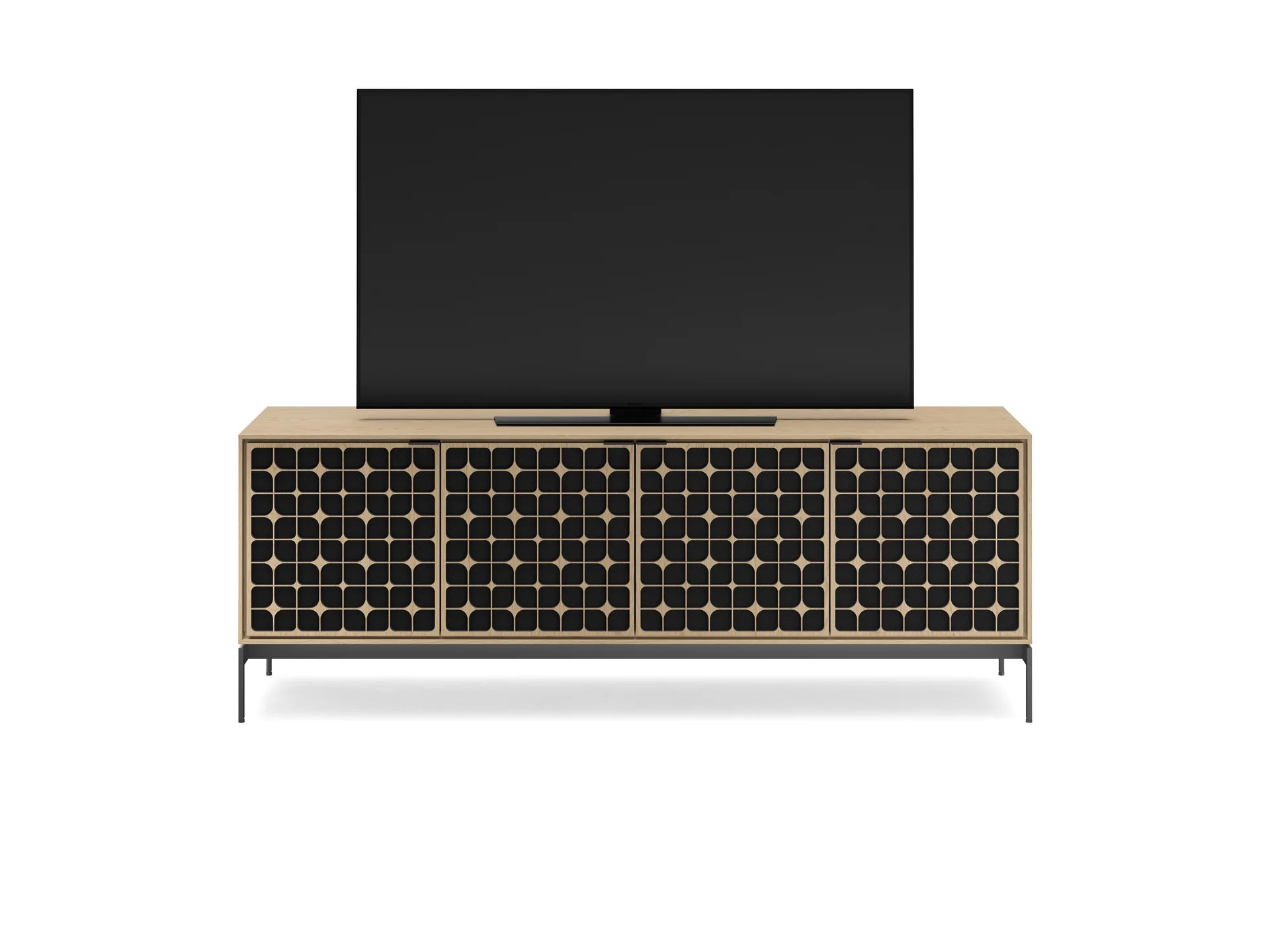 Behind Elements' CONSTELLATION doors, adjustable shelves and spacious interiors offer versatile storage solutions, perfect for both media components and everyday essentials. The celestial pattern not only enhances the cabinet's design but it is also engineered for acoustic transparency, ensuring flawless performance for enclosed speakers and soundbars, all while keeping your belongings beautifully organized.
