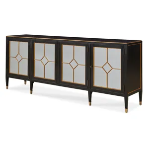 The Wendell Hall Cabinet features a polished, black lacquer case with a classic clipped corner, raised bead detail on each of the four doors finished in solid gold leaf. The top beveled edge detail is also finished in gold leaf. Brass ferrules and triangular drop pendant hardware with beveled, square back plates add the finishing touches to the exterior.