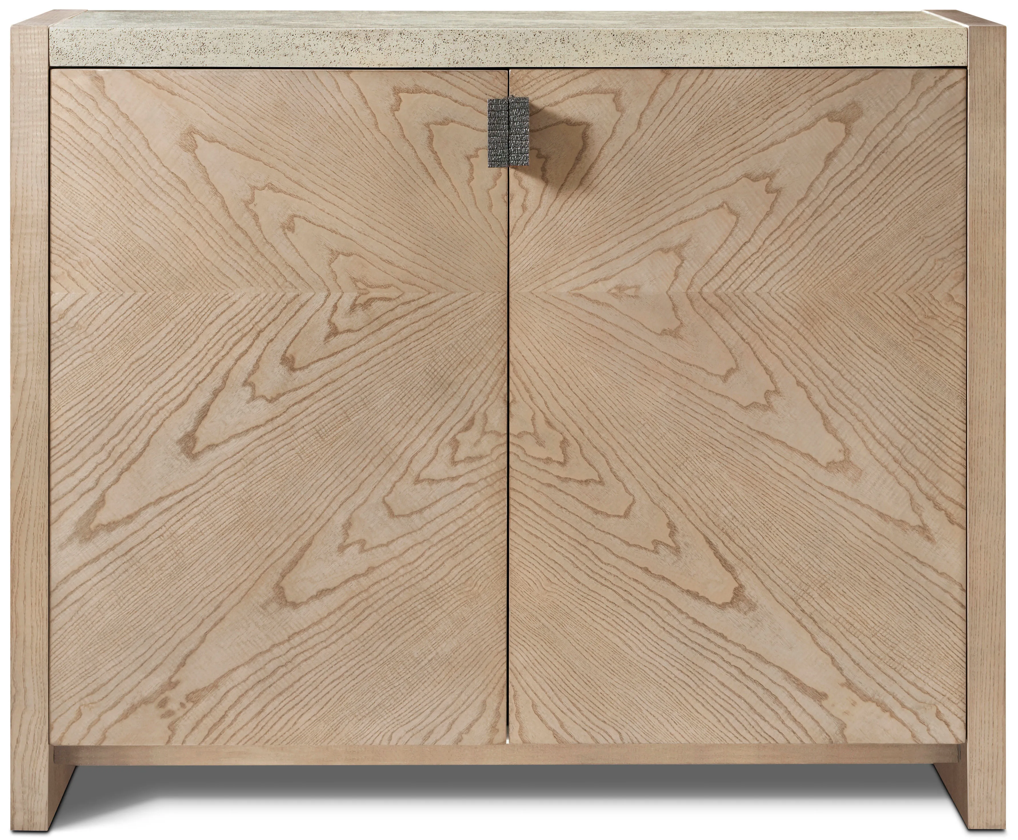 Figured two door hall chest in cathedral ash with peaceful symmetry available in Earth or Dune. Completed with textured metal pulls in our new Ember finish and a stone-like porous top in our exclusive Mineral finish. Includes an adjustable shelf.